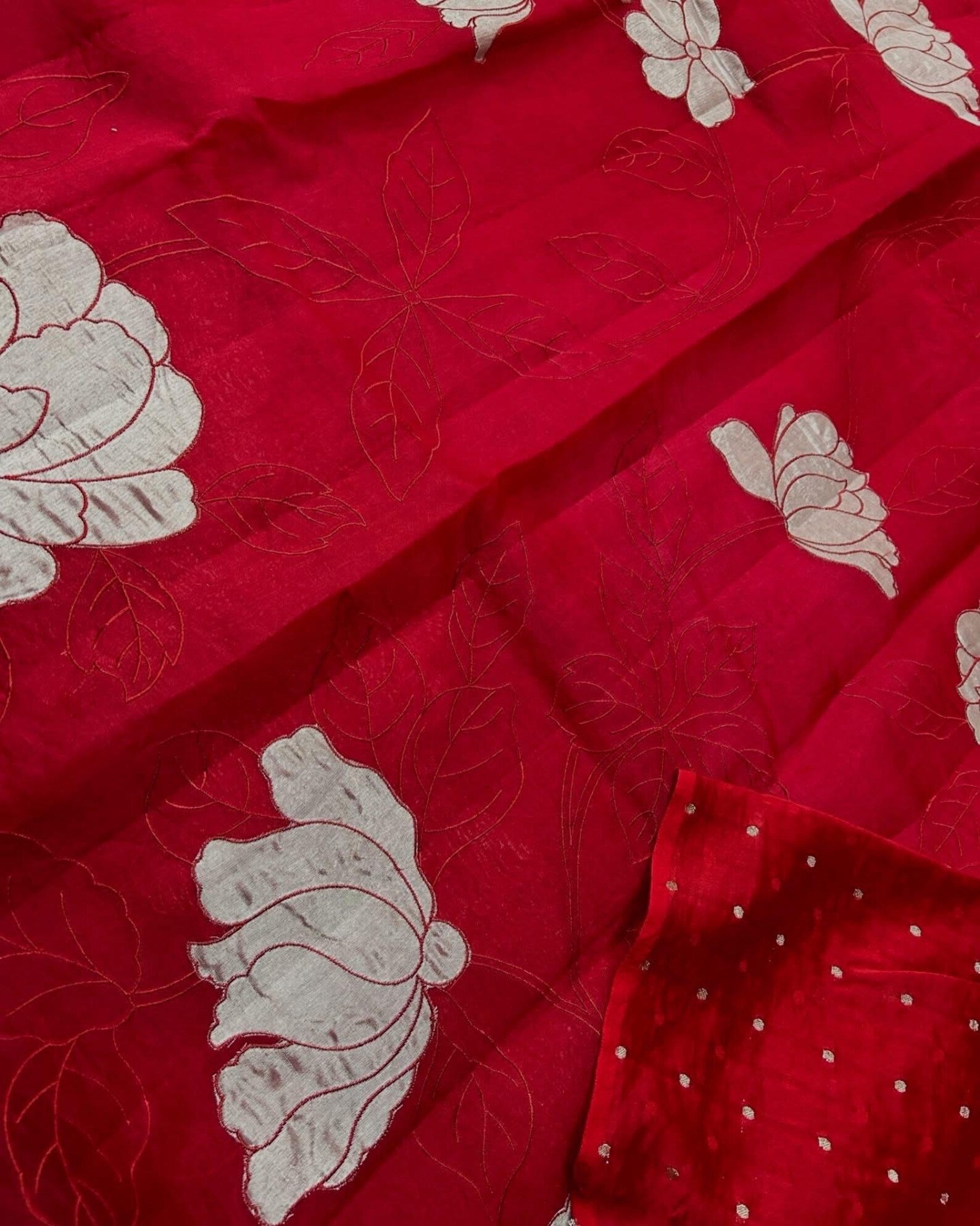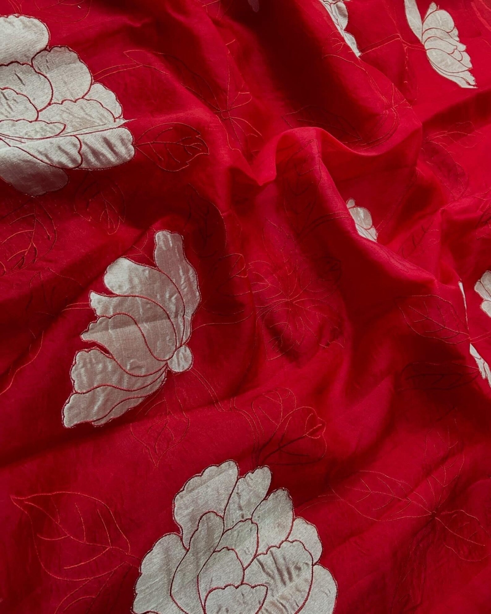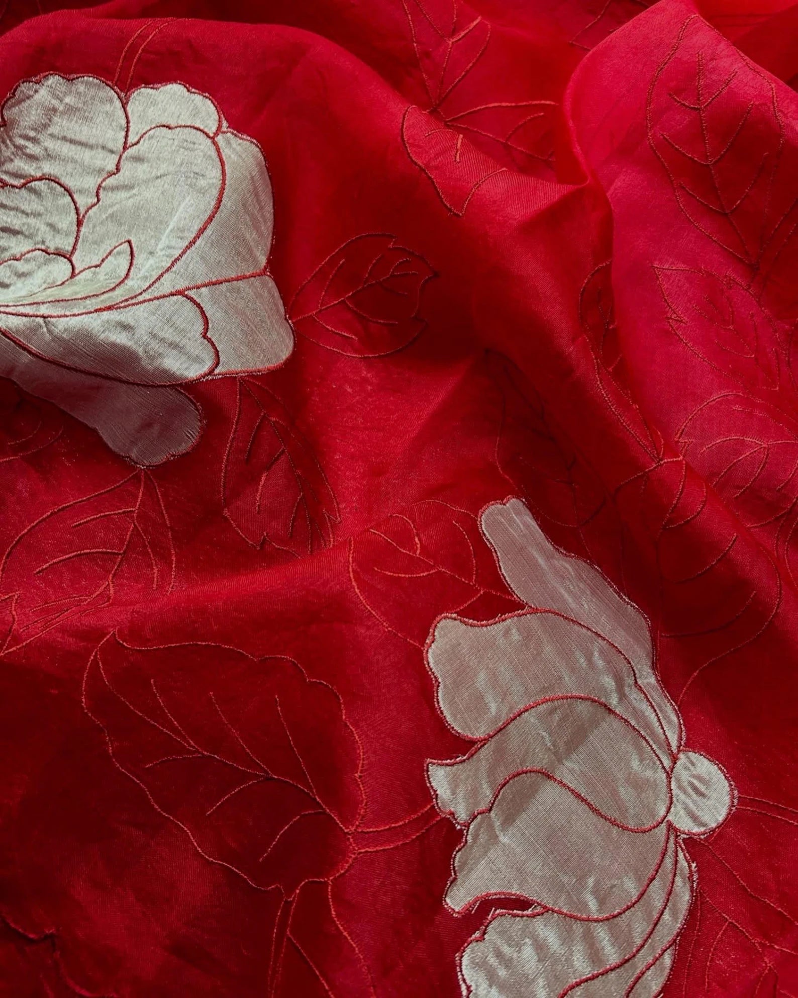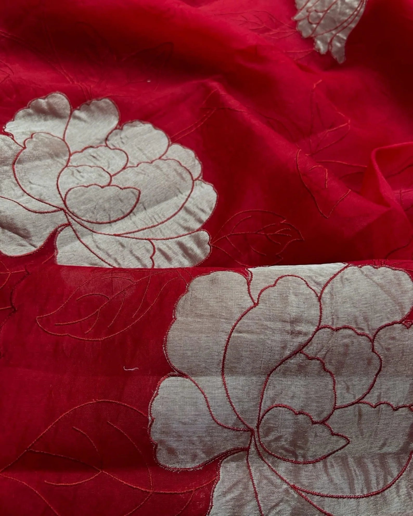 Banarasi Pure Silk Kora Organza- Deep Red Color/ Light gold Zari appliqué Zari motifs/ Silk Mark Certified Handloom