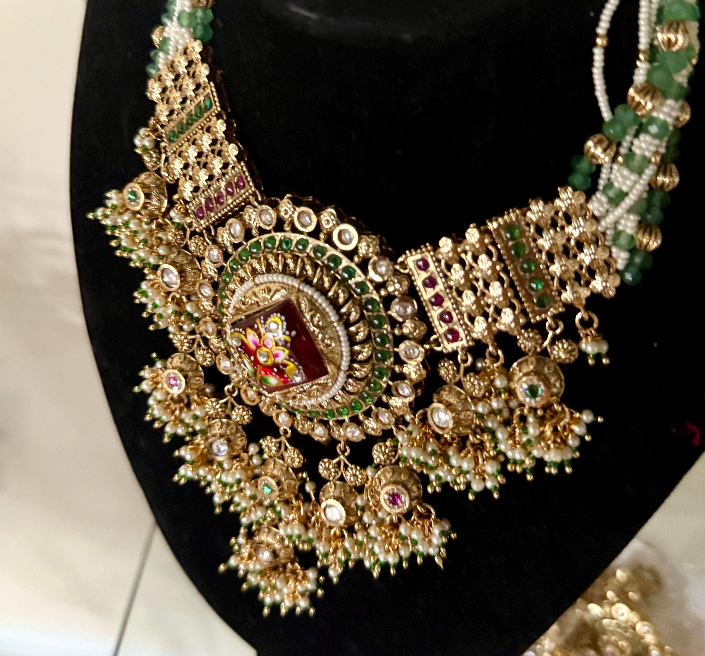 Diamonds/ Ruby beads/ semi precious beads/ antique finishing/wedding collection/Bridal Necklace jewelry. Multi strings of beads