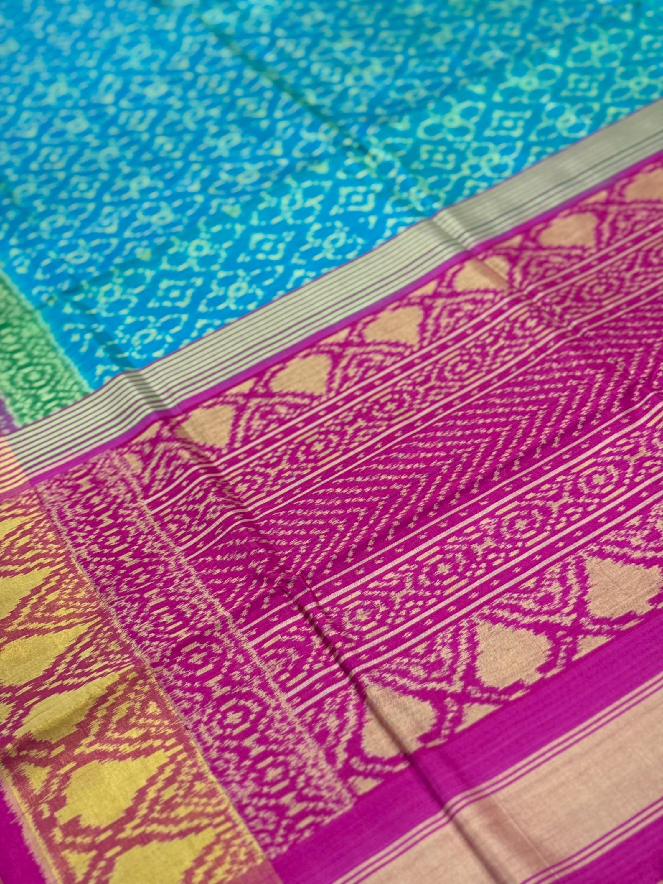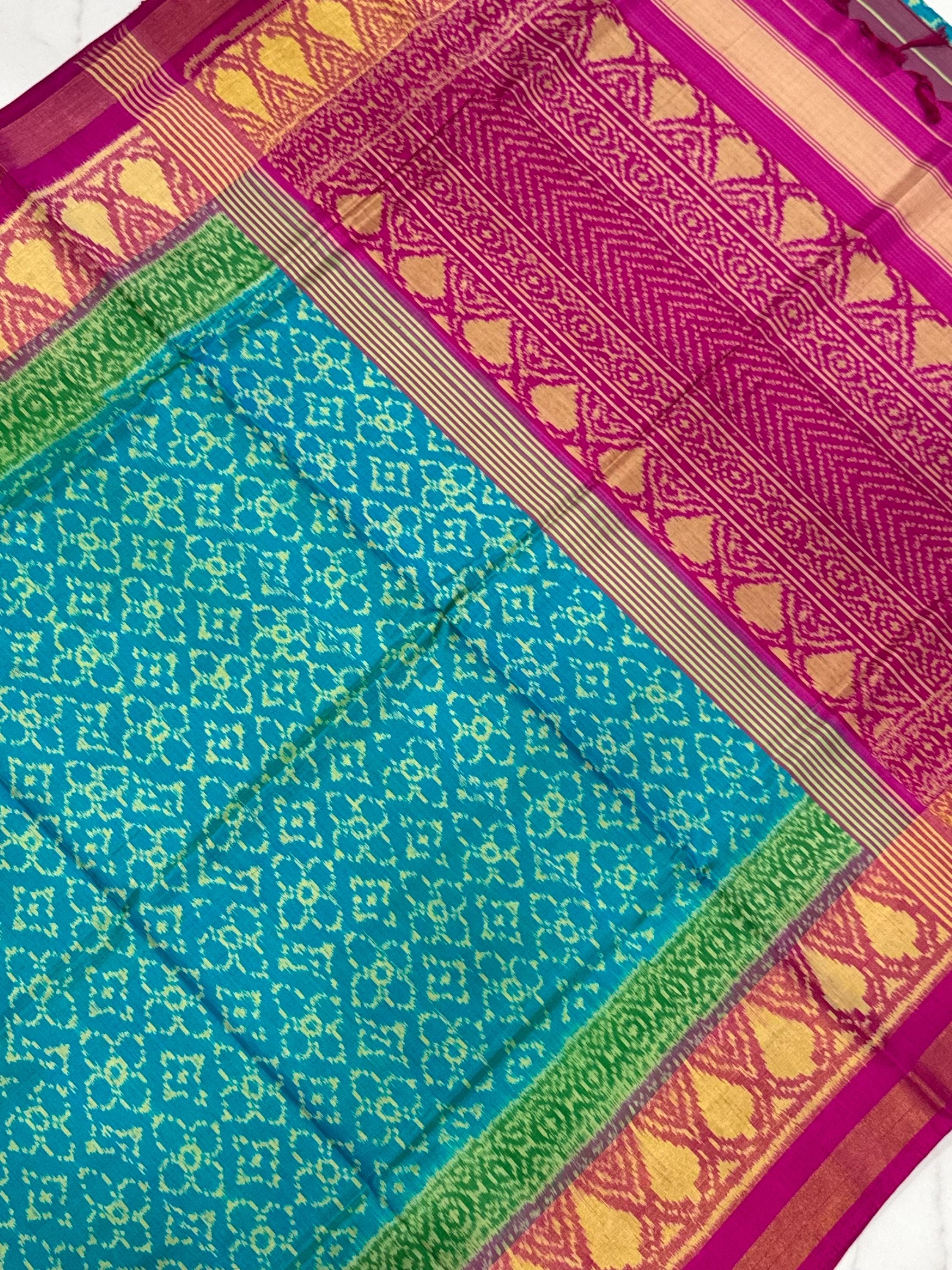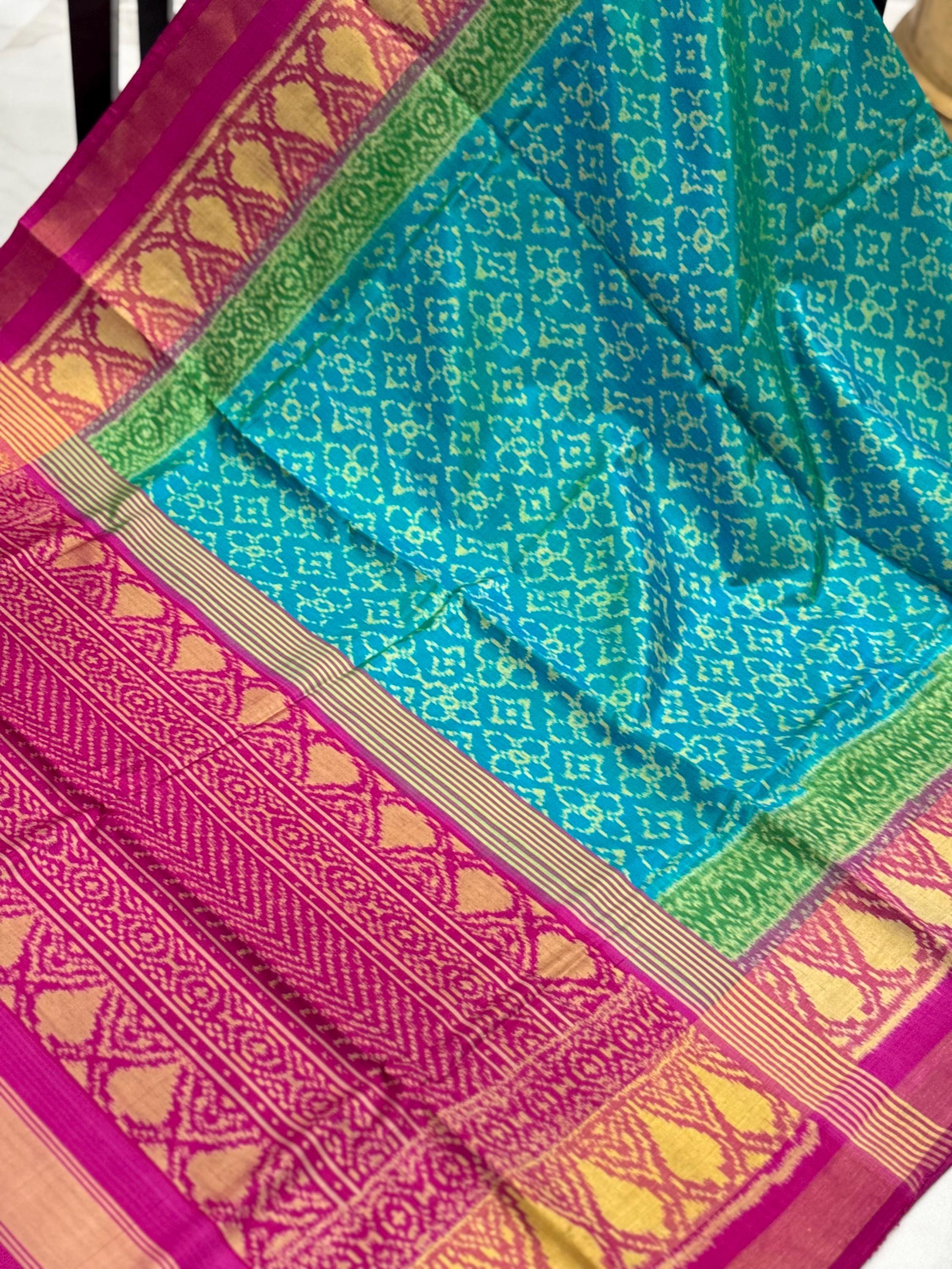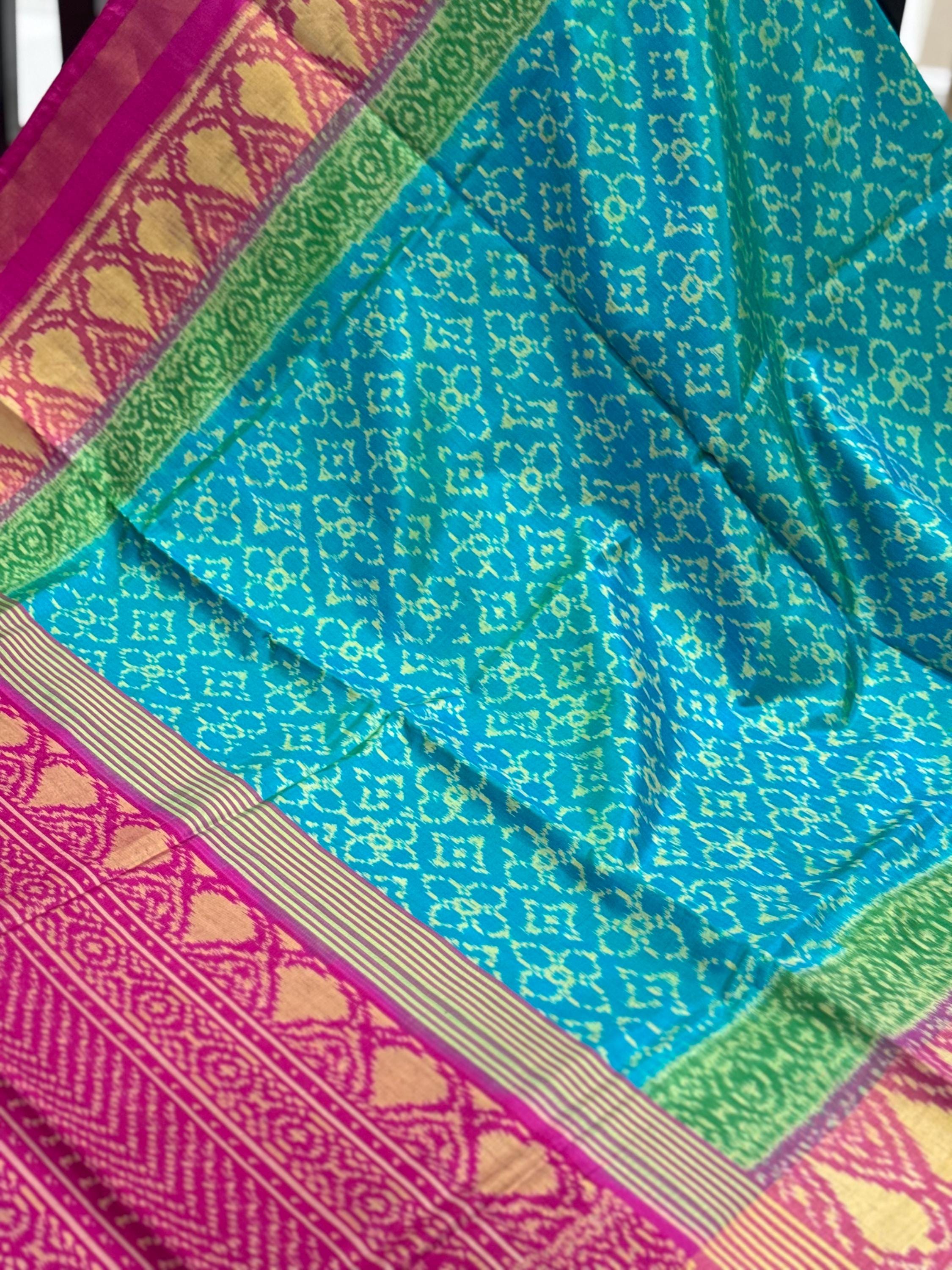 Handloom Rajkot Patol silk saree with pure silk weaving sareepaired with running silk blouse l Firozi blue/Magenta pink