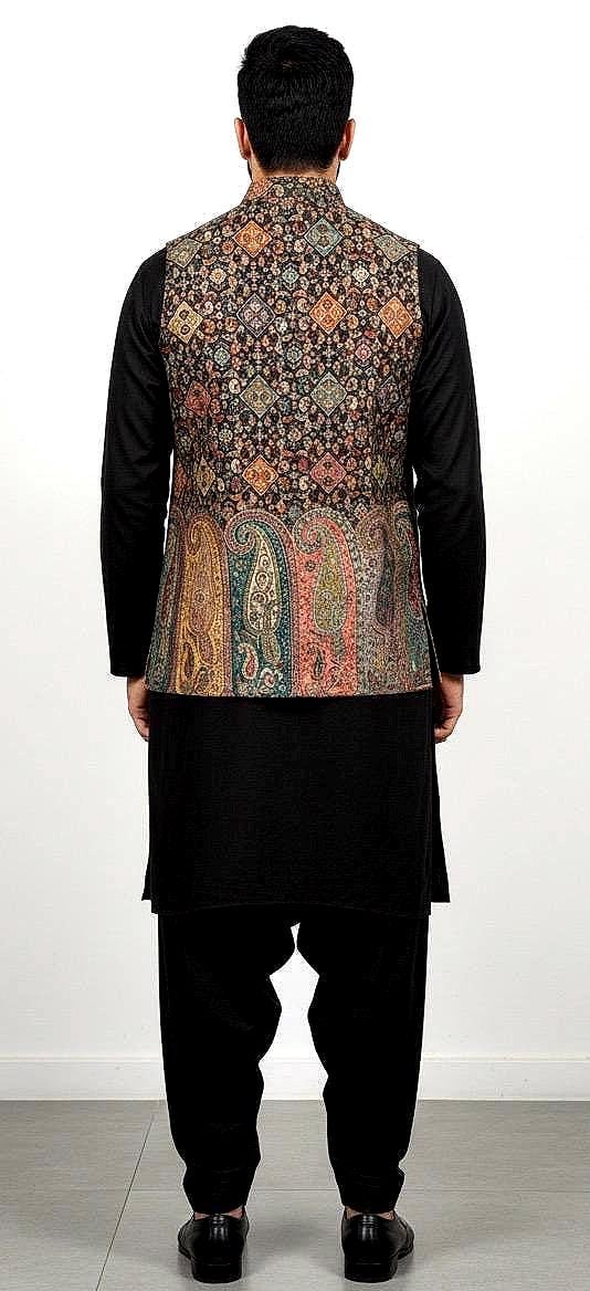 introducing our Multicoloured Waistcoat – a meticulously handcrafted piece that seamlessly blends traditional Indian craftsmanship with contemporary style. This waistcoat is a timeless addition to your wardrobe, showcasing an elegant black hue that exudes sophistication and versatility.