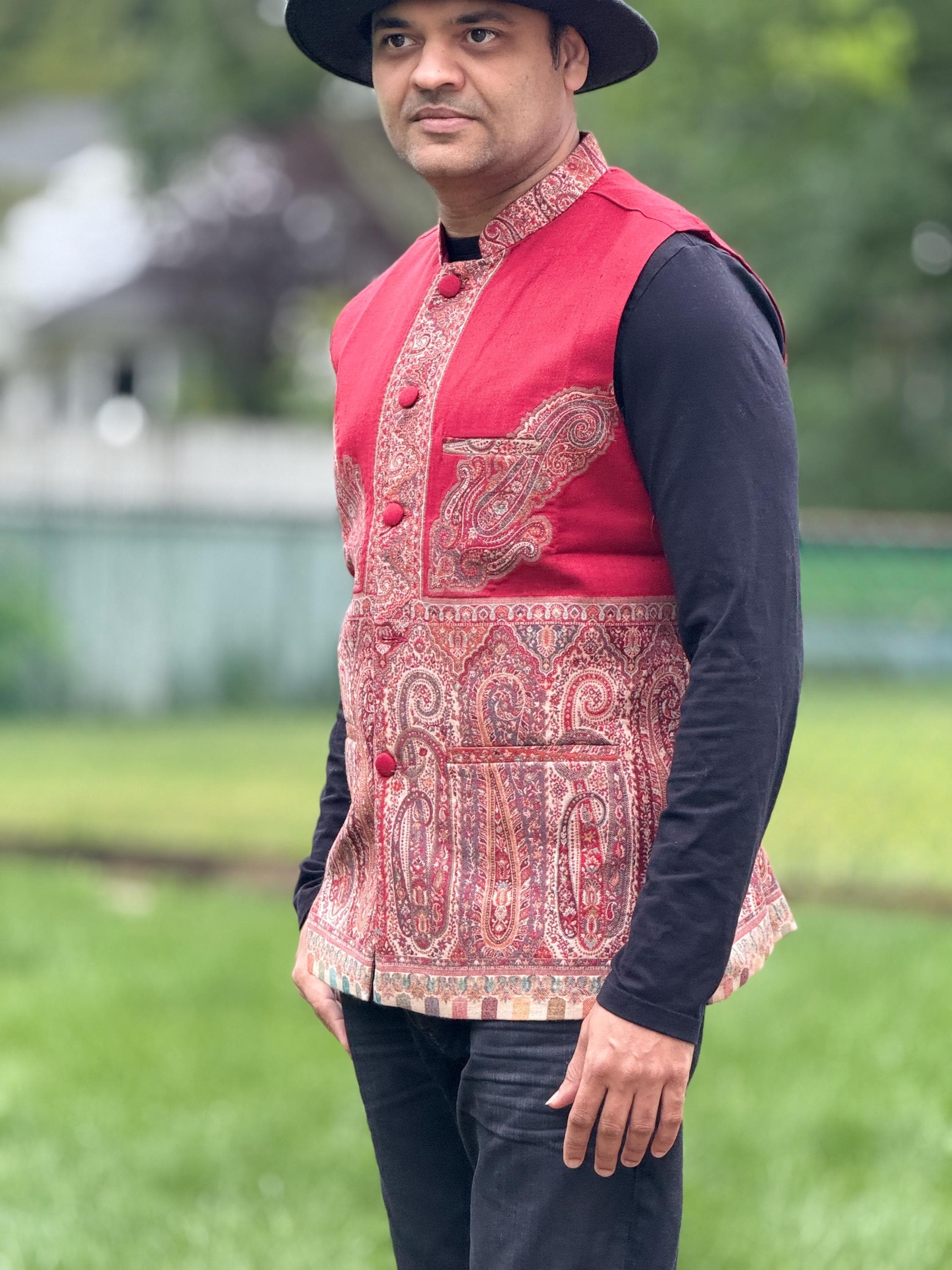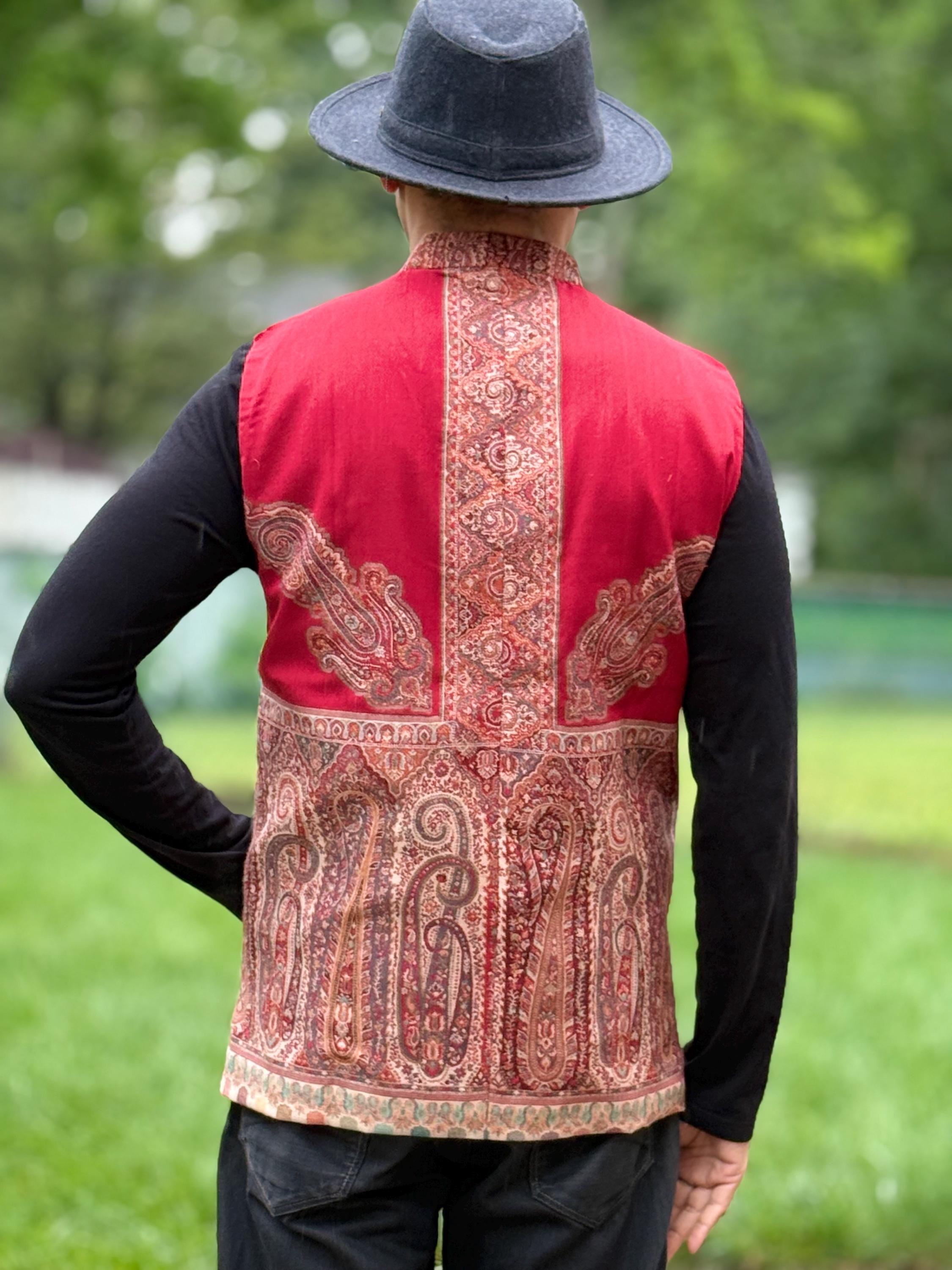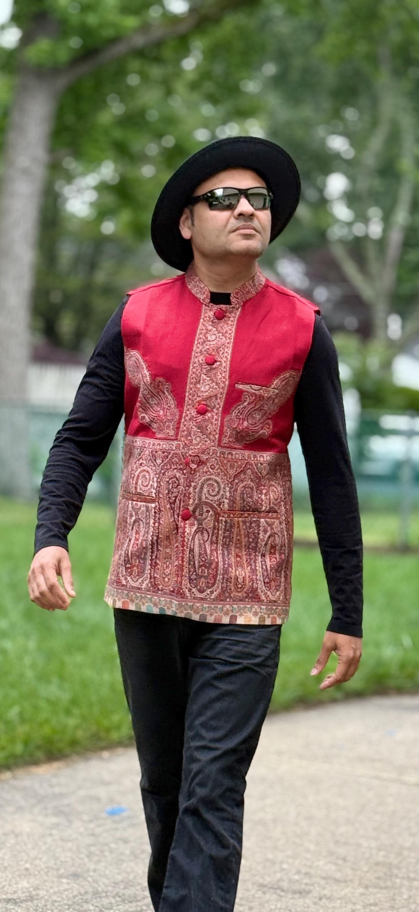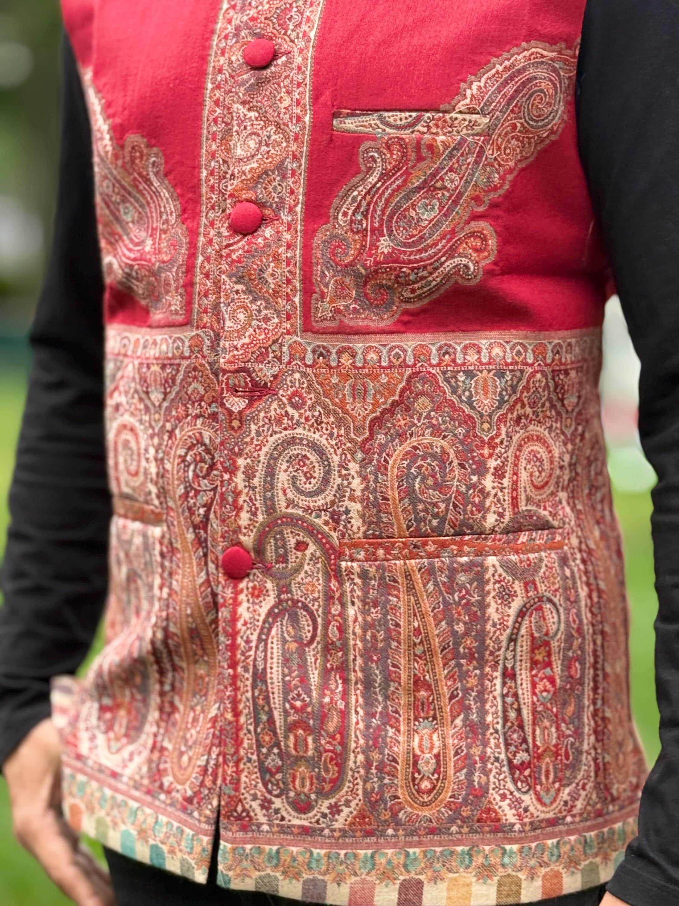 Kani pashmina Jamawar MENS WOVEN Paisley waistcoats, structured slim fit |Red foundation | Statement fashion wear| size 44,46,48