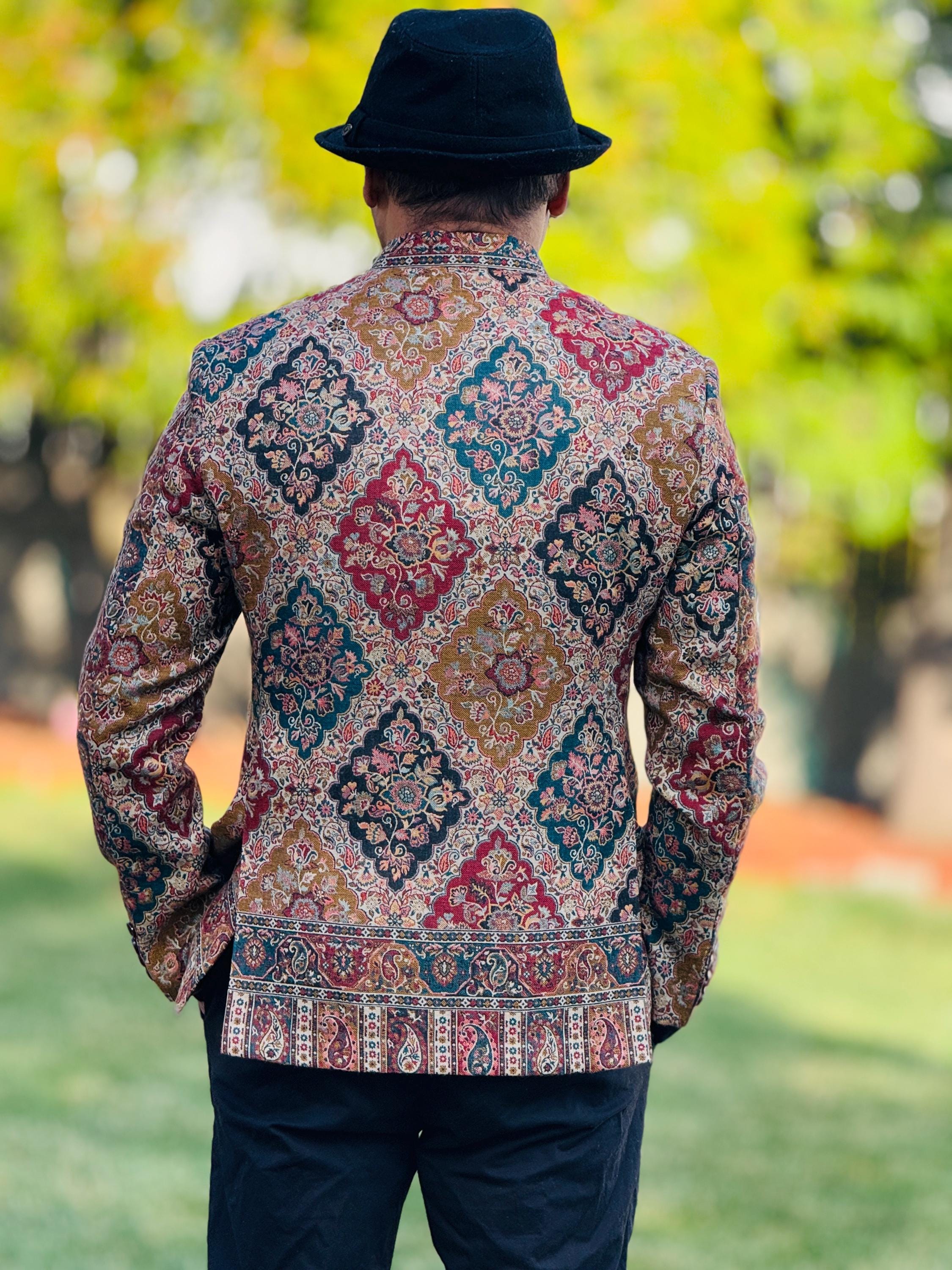introducing our Multicoloured jacket – a meticulously handcrafted piece that seamlessly blends traditional Indian craftsmanship with contemporary style. This coat is a timeless addition to your wardrobe, showcasing an elegant black hue that exudes sophistication and versatility.