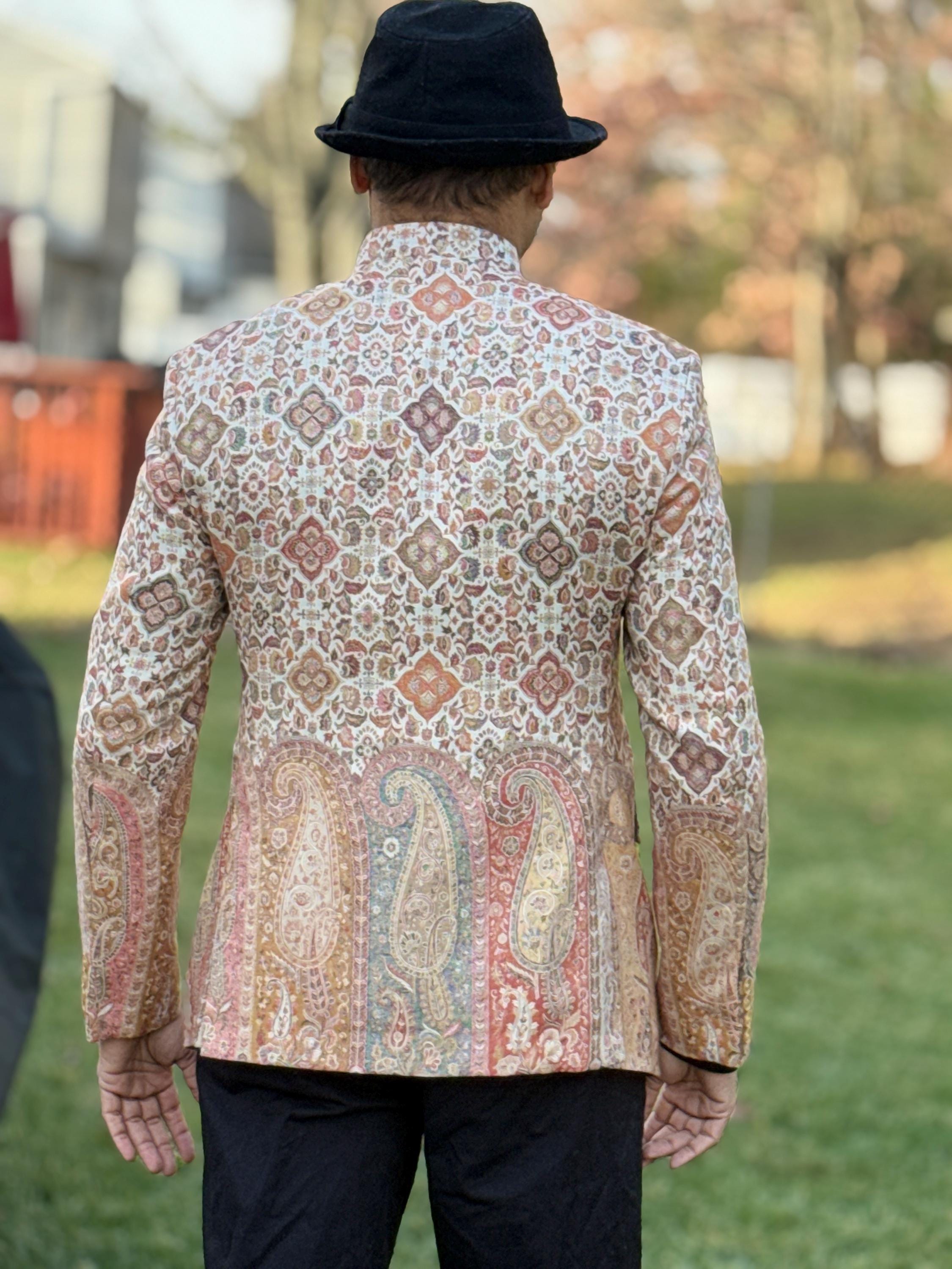 introducing our Multicoloured jacket – a meticulously handcrafted piece that seamlessly blends traditional Indian craftsmanship with contemporary style. This coat is a timeless addition to your wardrobe, showcasing an elegant black hue that exudes sophistication and versatility.