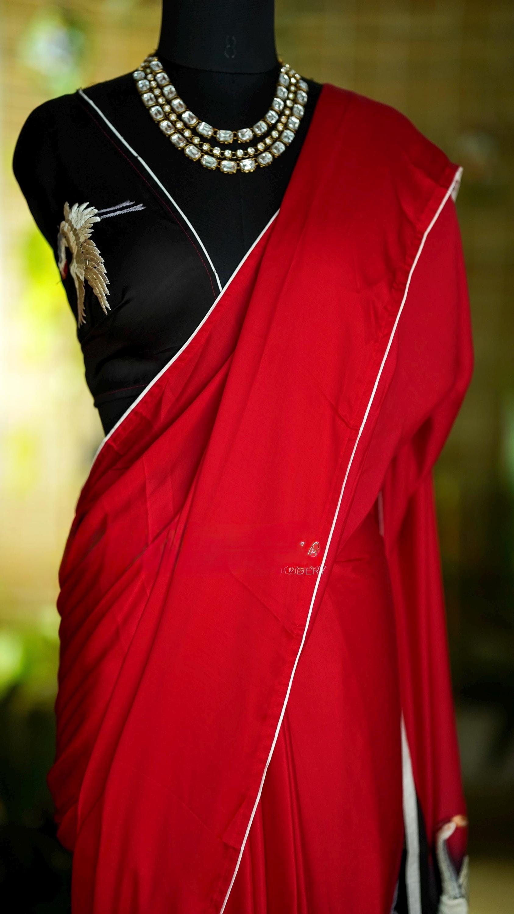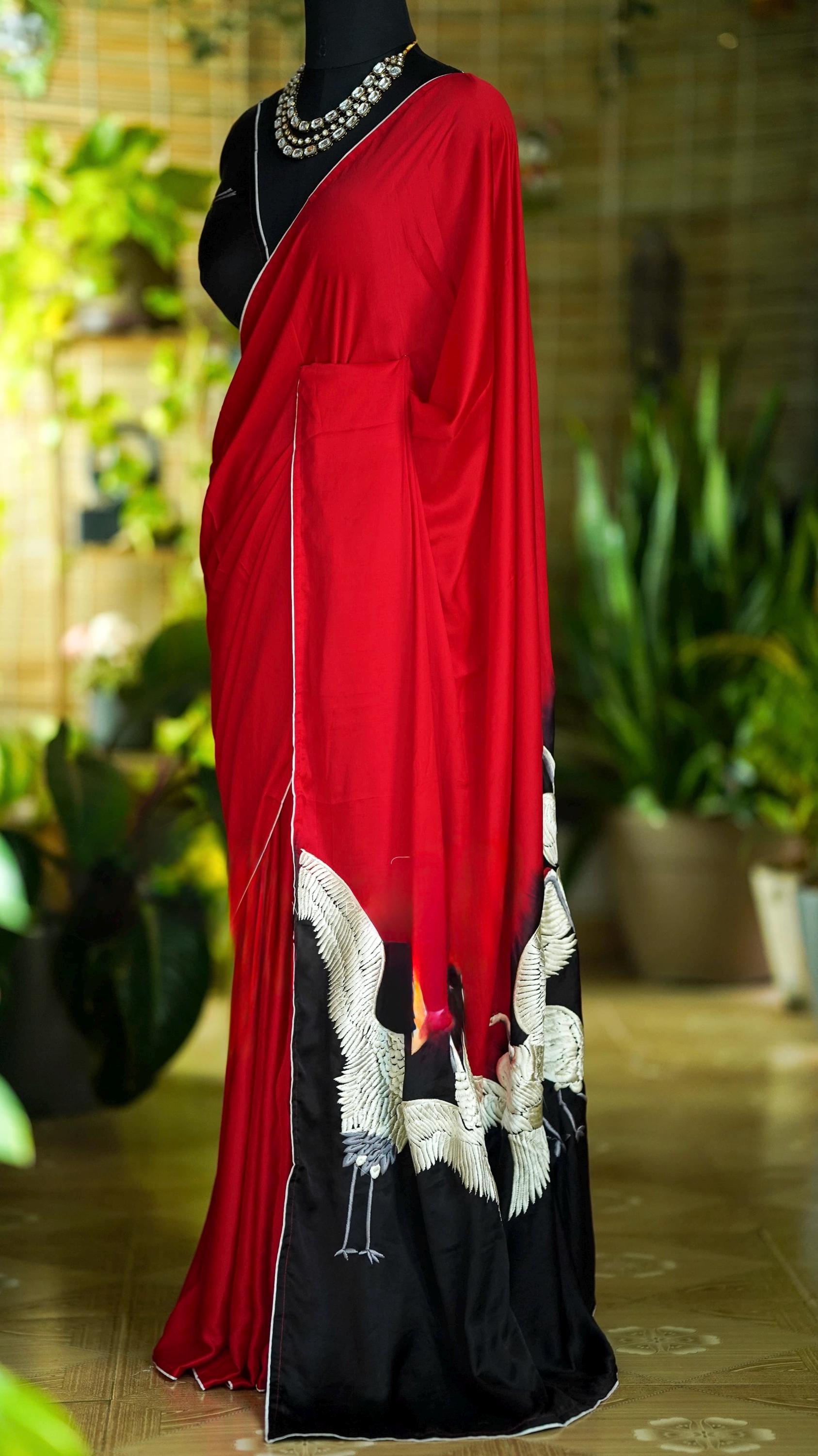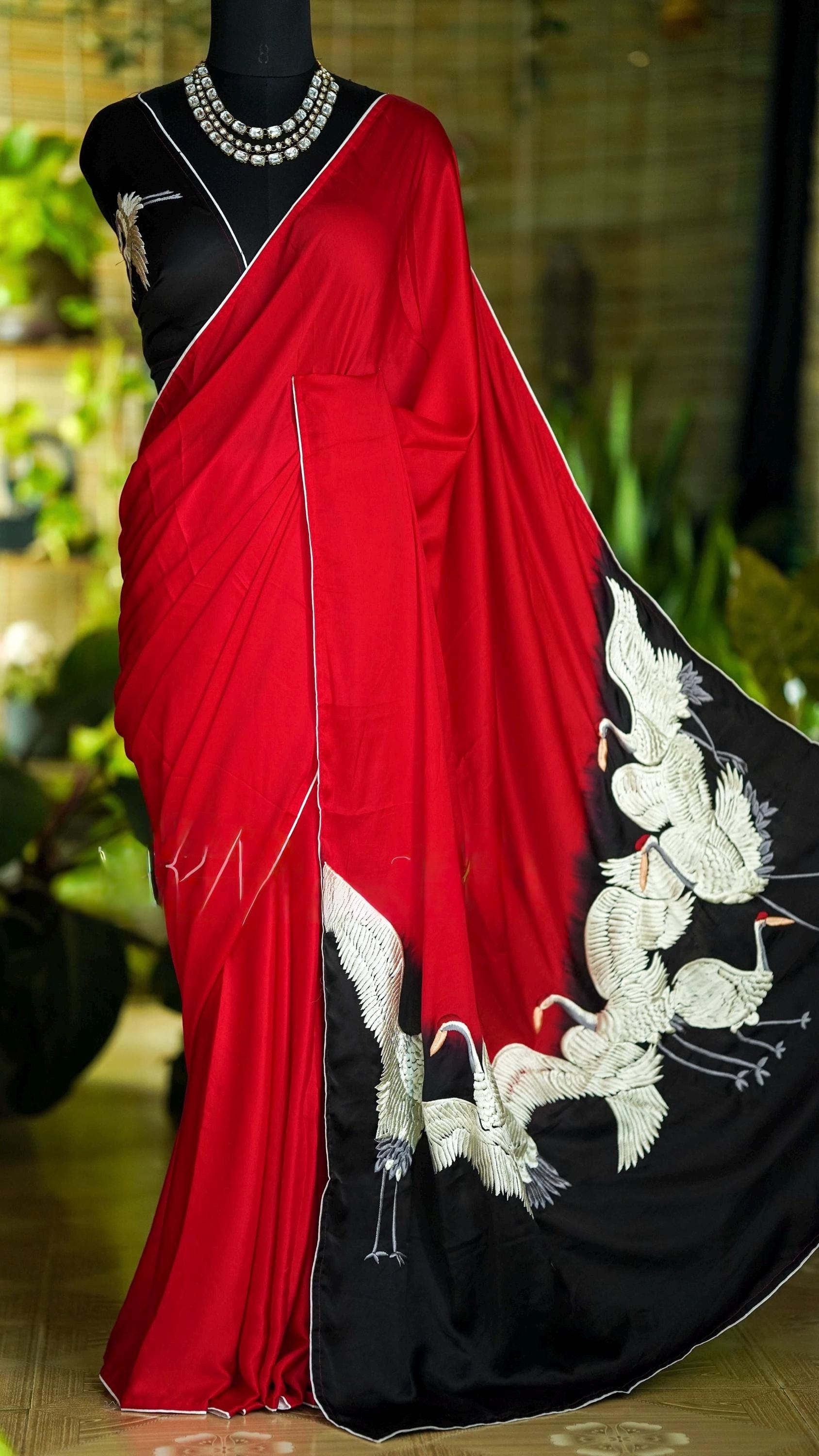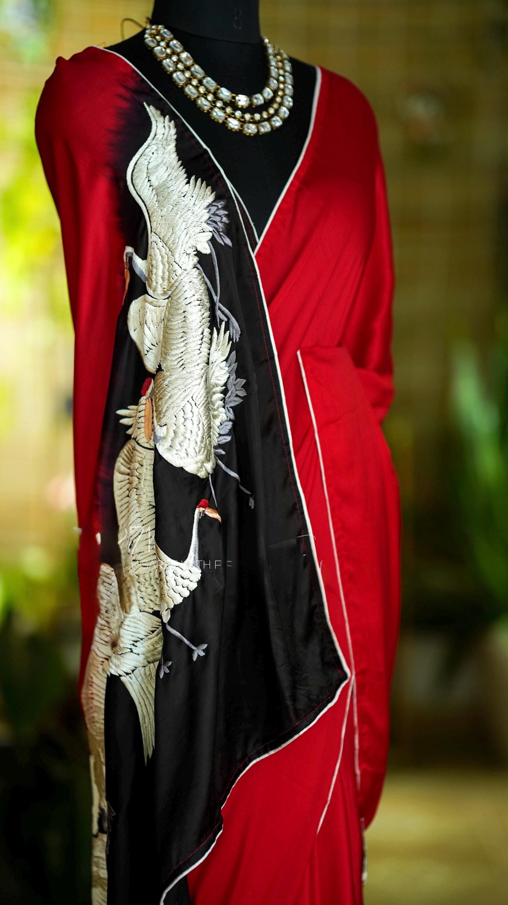 Crafted on luxurious Italian Crepe Silk, this saree showcases intricate Parsi embroidery featuring graceful flying birds, meticulously done with fine white thread work. The striking red body is beautifully complemented by a black pallu, creating a bold yet refined color harmony that makes a lasting impression.