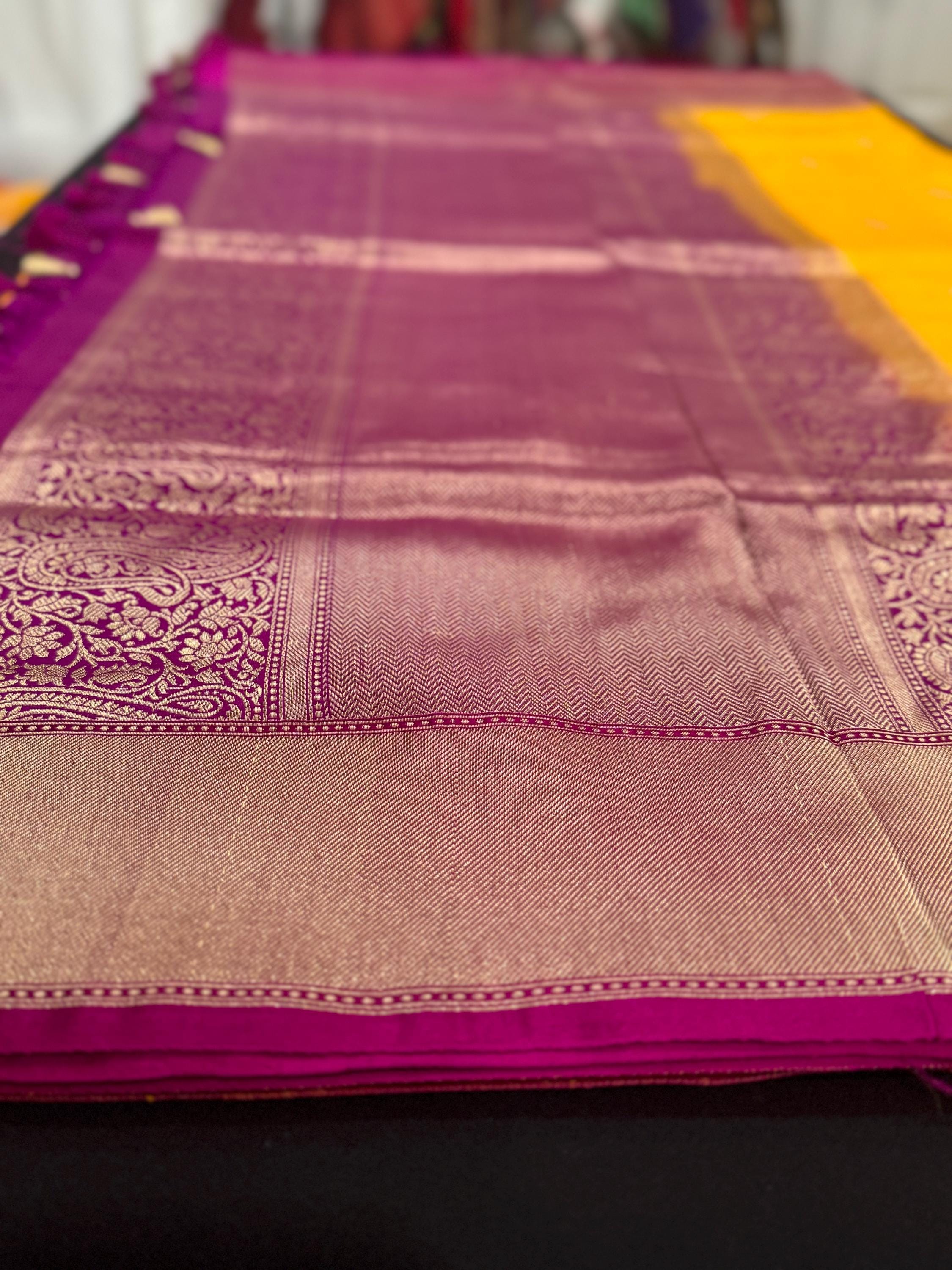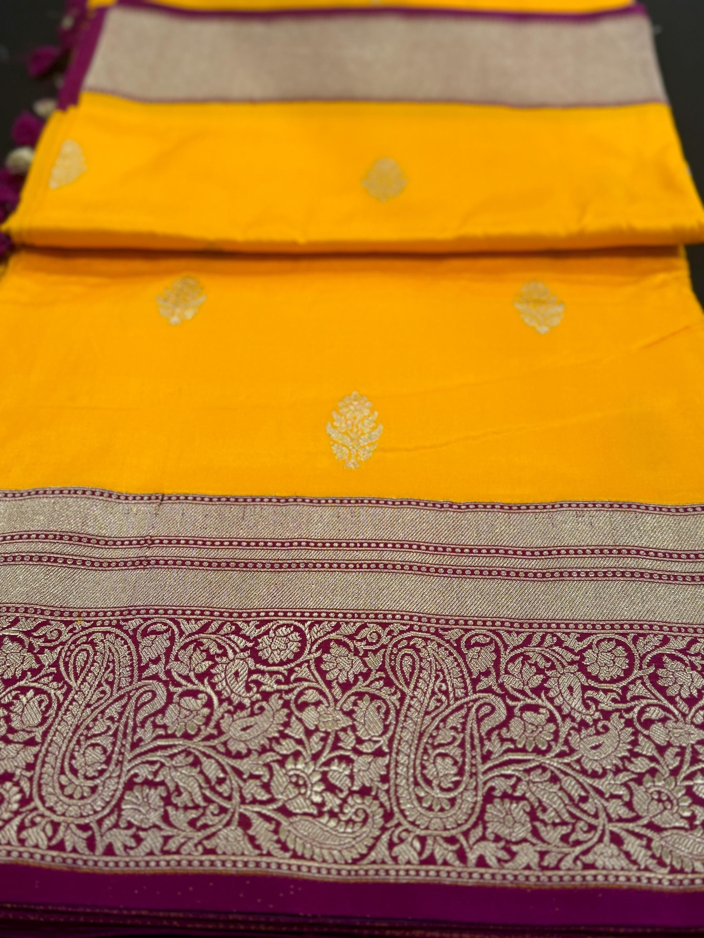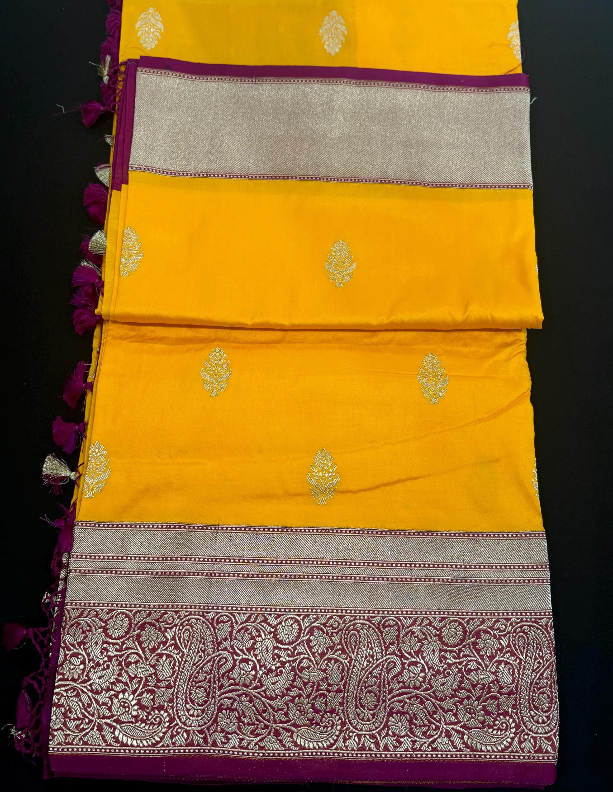 Saree Color - Bright Yellow/magenta plain gold Jari border