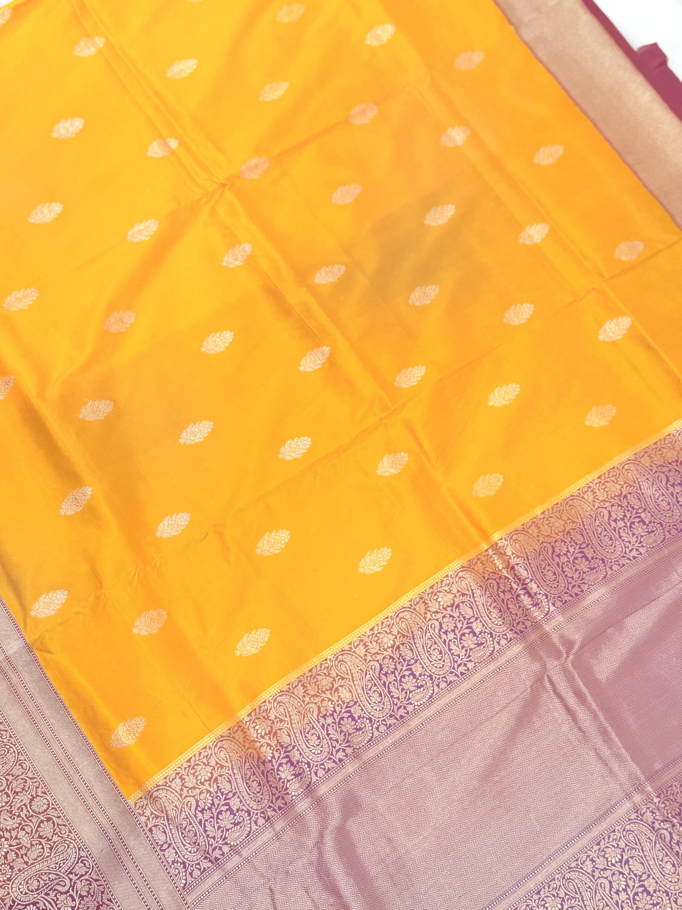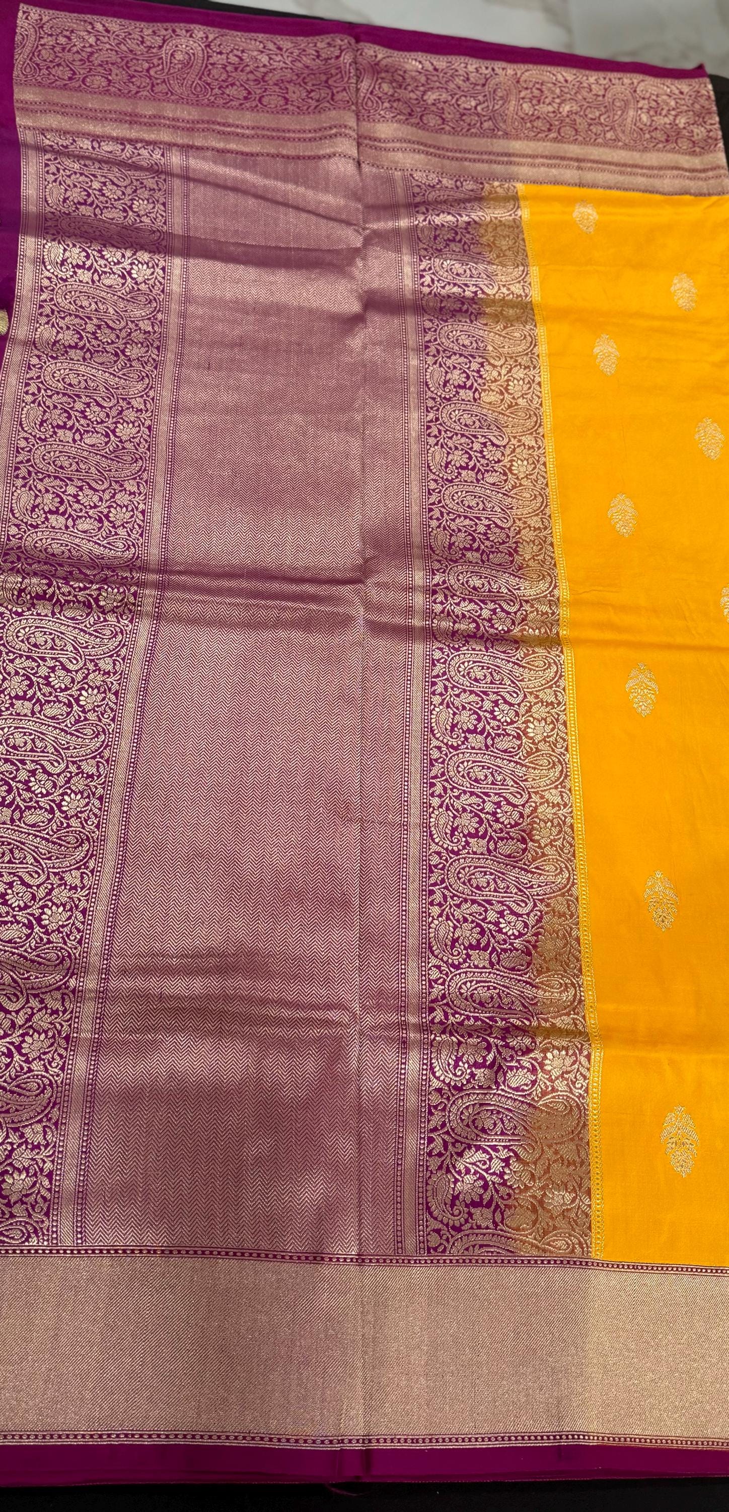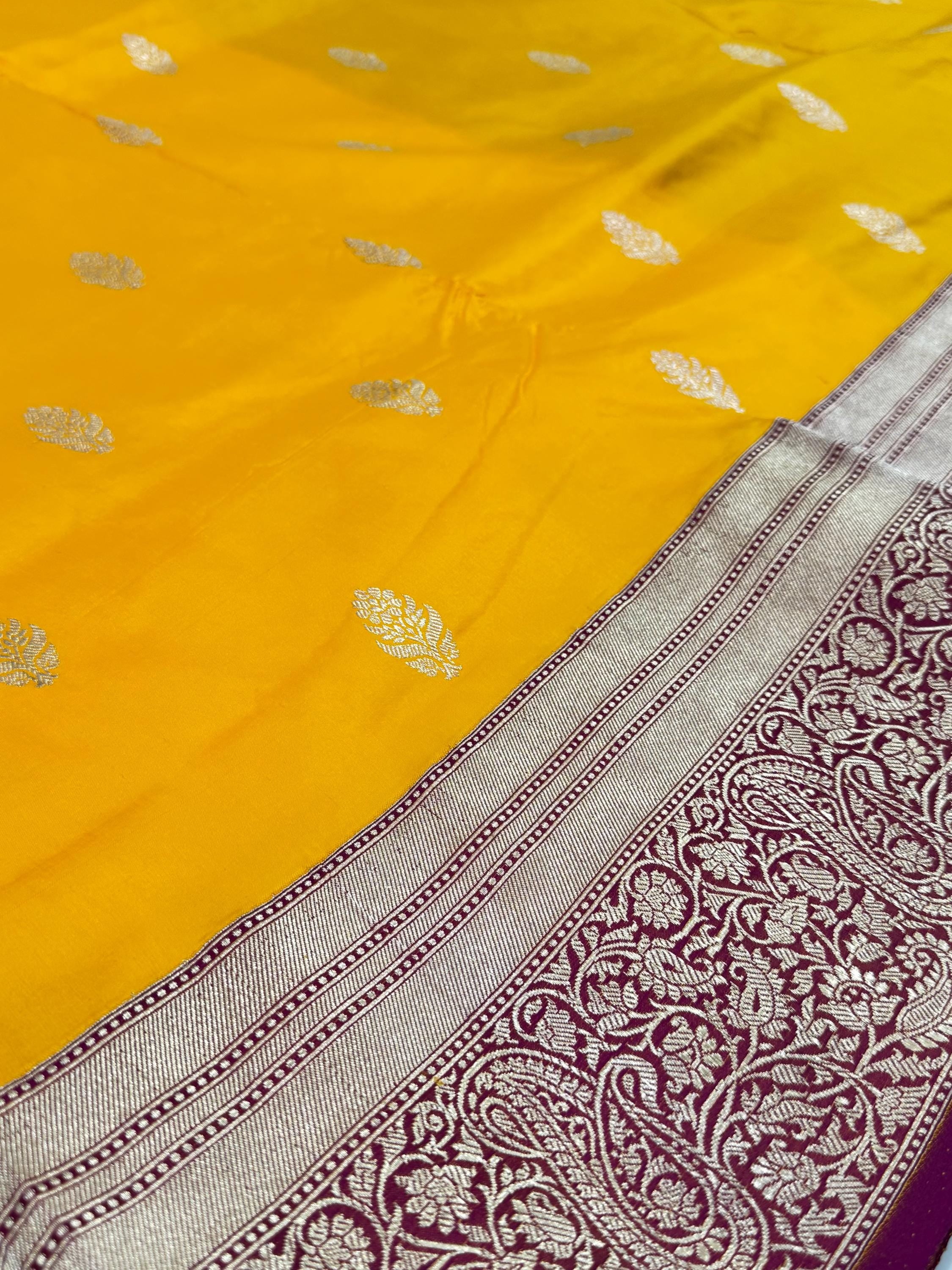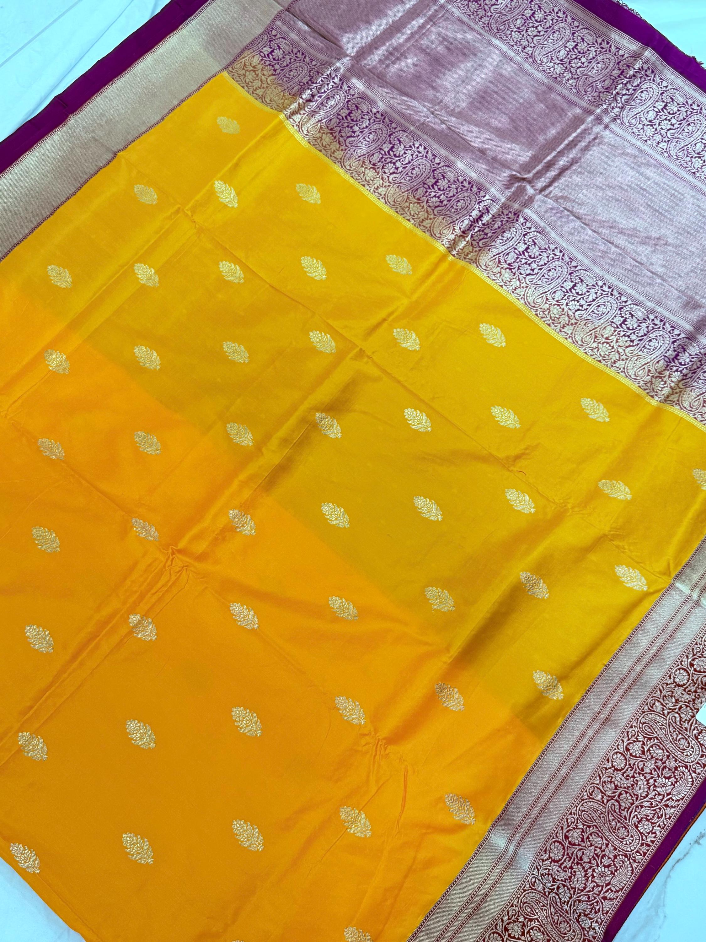Saree Color - Bright Yellow/magenta plain gold Jari border