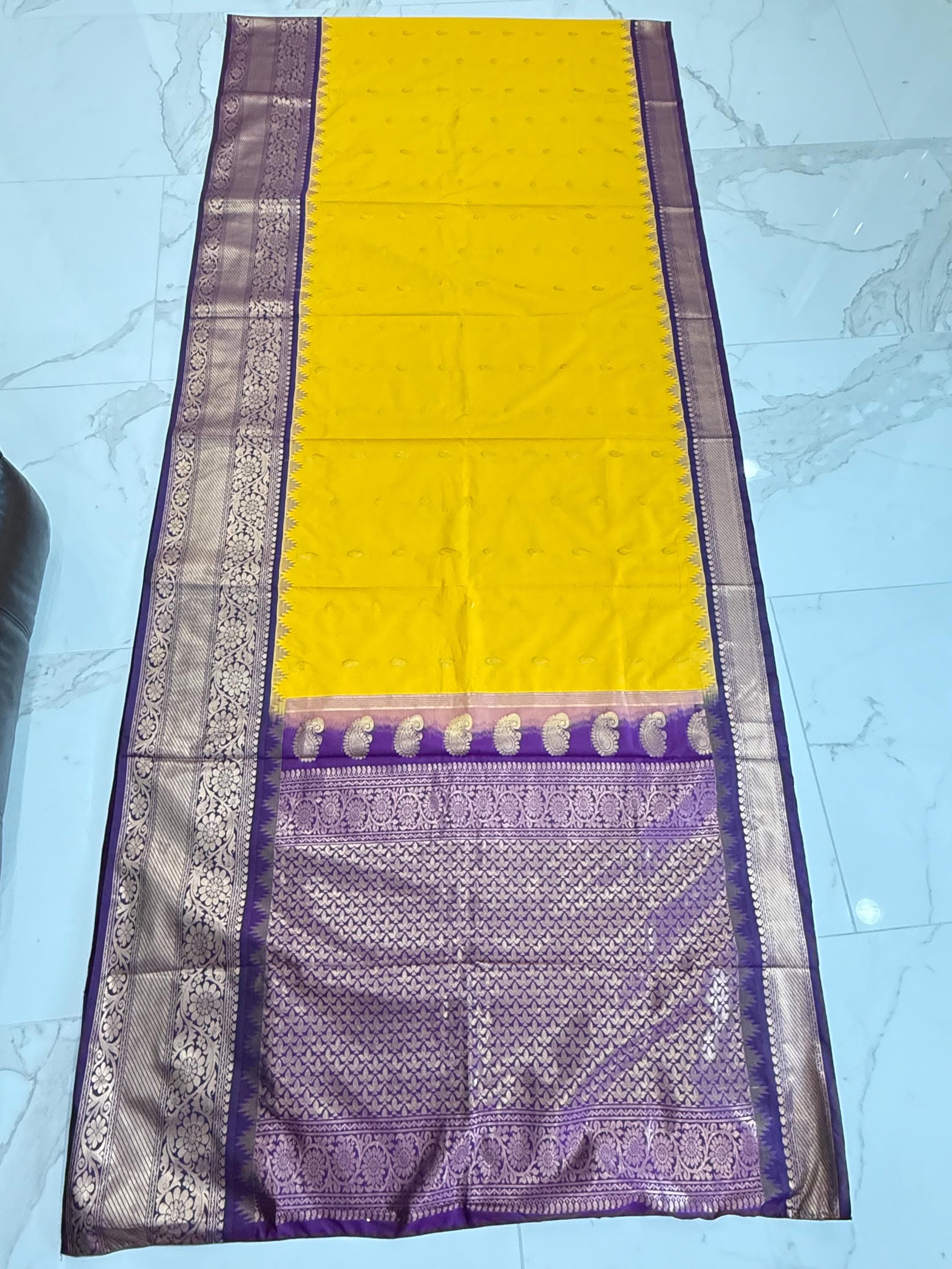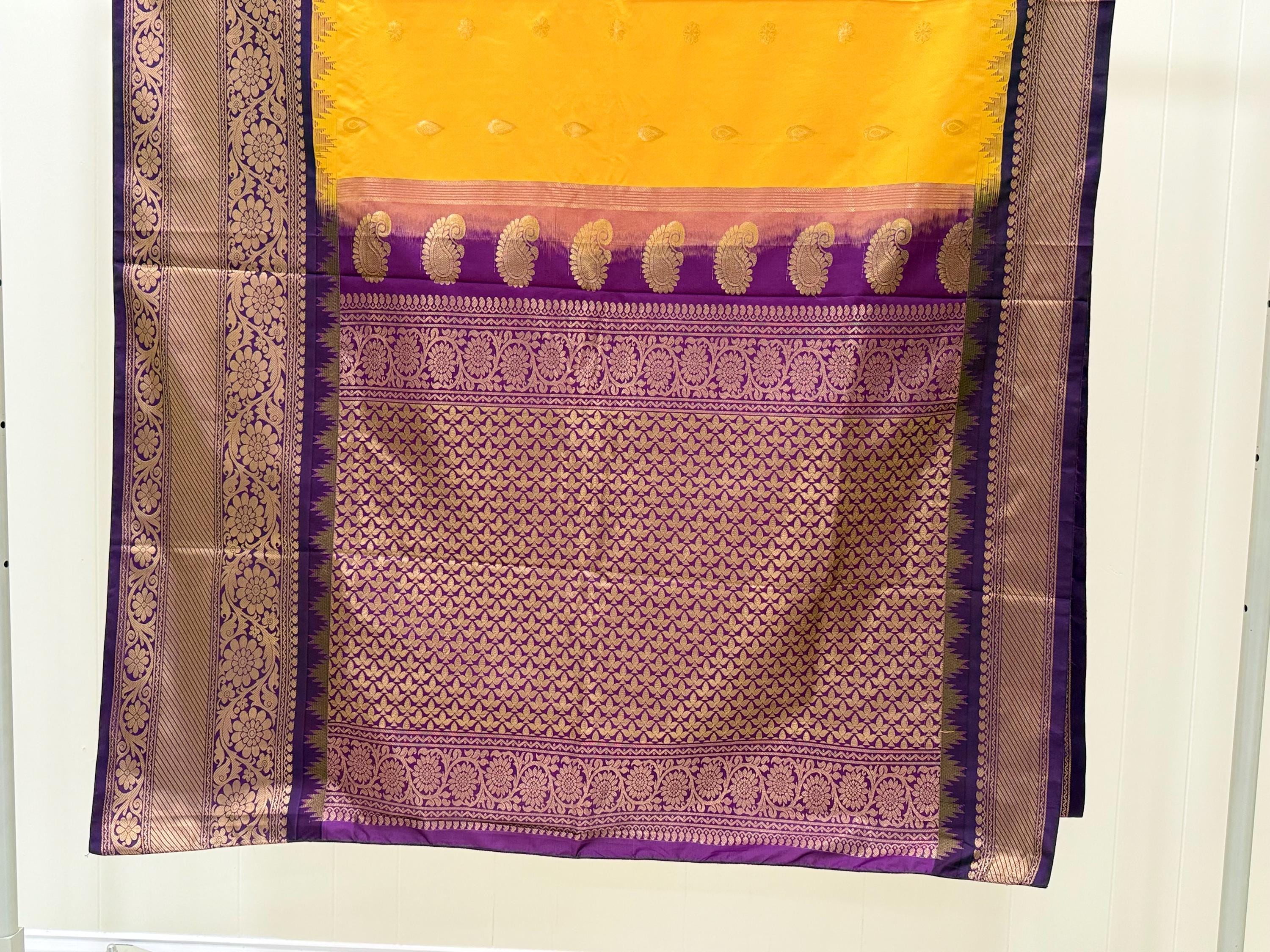 Pure Gadwal Silk saree in a unique Yellow with purple border combination. The body of the saree is Yellow color and features golden zari buttas and a black border with golden zari all over with a rich pallu.