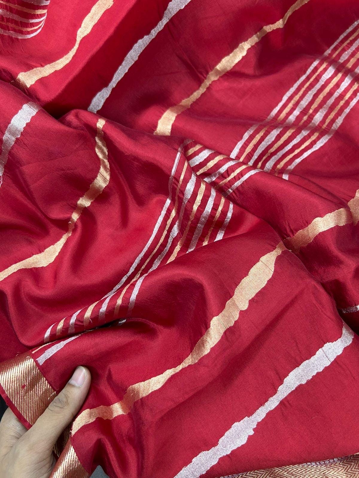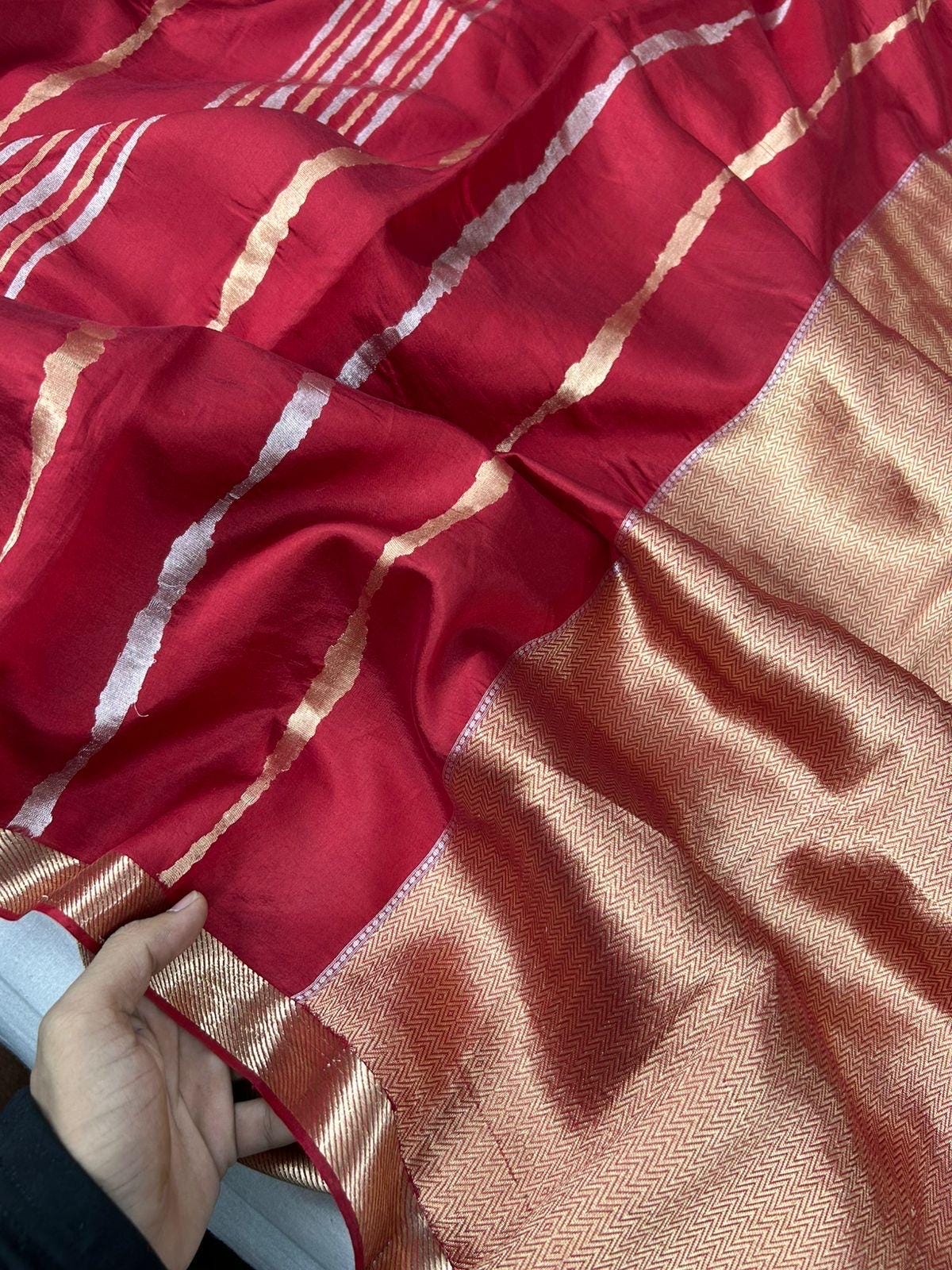 What truly sets this saree apart is the Sona-Roopa (gold and silver) zari work woven in beautiful vertical stripes across the body. The intricate motifs are crafted using the traditional Kadhuwa weaving technique, one of the most refined and labor-intensive forms of Banarasi weaving. Each motif is individually handwoven on the loom — not embroidered — making every inch of this saree a reflection of unparalleled craftsmanship and artistic precision.